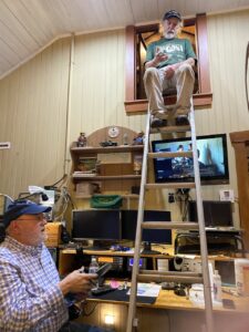 After lots of teamwork to acquire and assemble our new antenna, the XR5 is on top of the tower. It “gets out” with 2 elements on 20, 17, 15, 12, 10, and 6 meters from about 600′ above average terrain. See Pictures for a view of the action…
